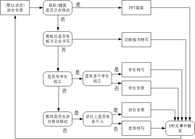 采用4K超清摄像机,内置电子云镜跟踪分析软件,可以在拍摄到的全景画面中再“裁剪”1个特写画面,取代两台传统摄像机,只需两机位就可以实现教师全景&特写,学生全景&特写的拍摄。